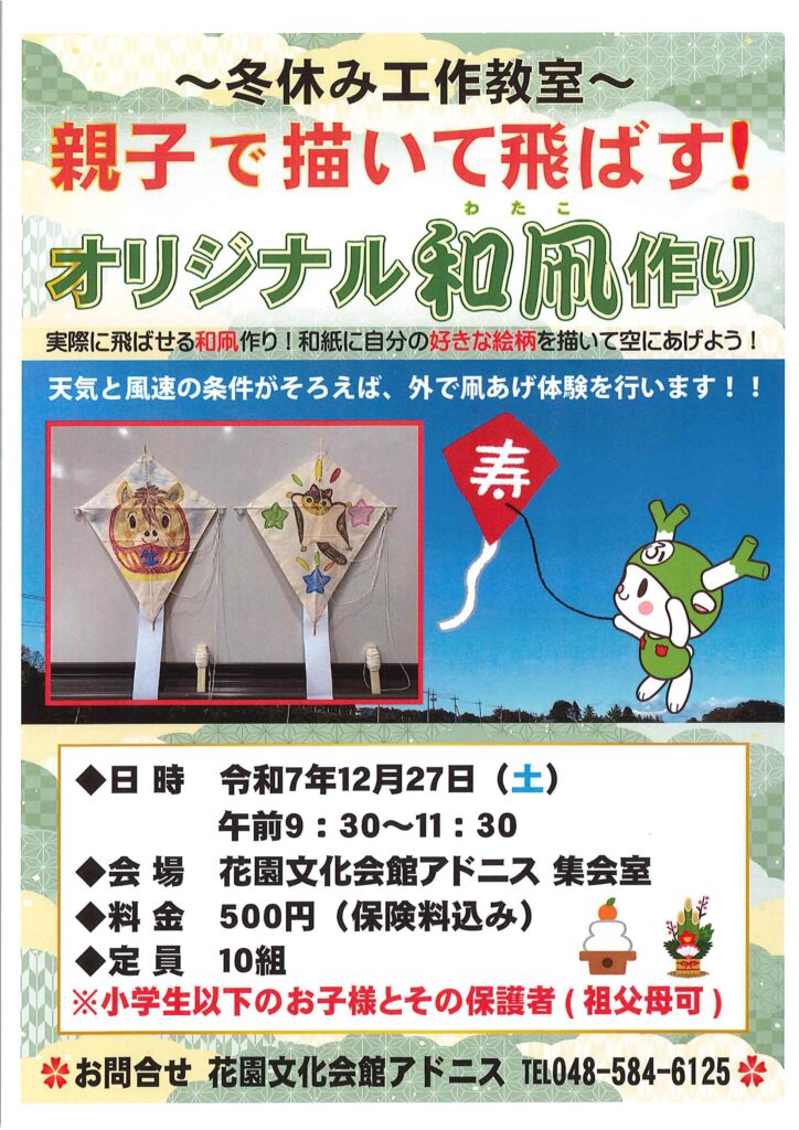 花園文化会館アドニスにて ~冬休み工作教室~ 親子で描いて飛ばすオリジナル和凧作りを開催します。