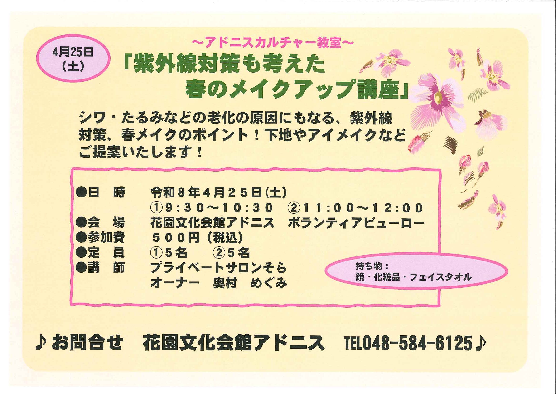 2026 4/25 4/25 カルチャー教室「紫外線対策も考えた春のメイクアップ講座」 開催日 2026年4月25日(土) 時 間 ①9:30~10:30 ②11:00~12:00 参加費 500円(税込) 定 員 ①5名 ②5名 講 師 プライベートサロンそら オーナー 奥村 めぐみ 主 催 公益財団法人深谷市地域振興財団(花園文化会館アドニス) お問合せ 花園文化会館アドニス ☎048-584-6125 受付日 2026年3月25日(水) 午前8時30分から Post Share Hatena Line RSS feedly Pin it note イベント一覧