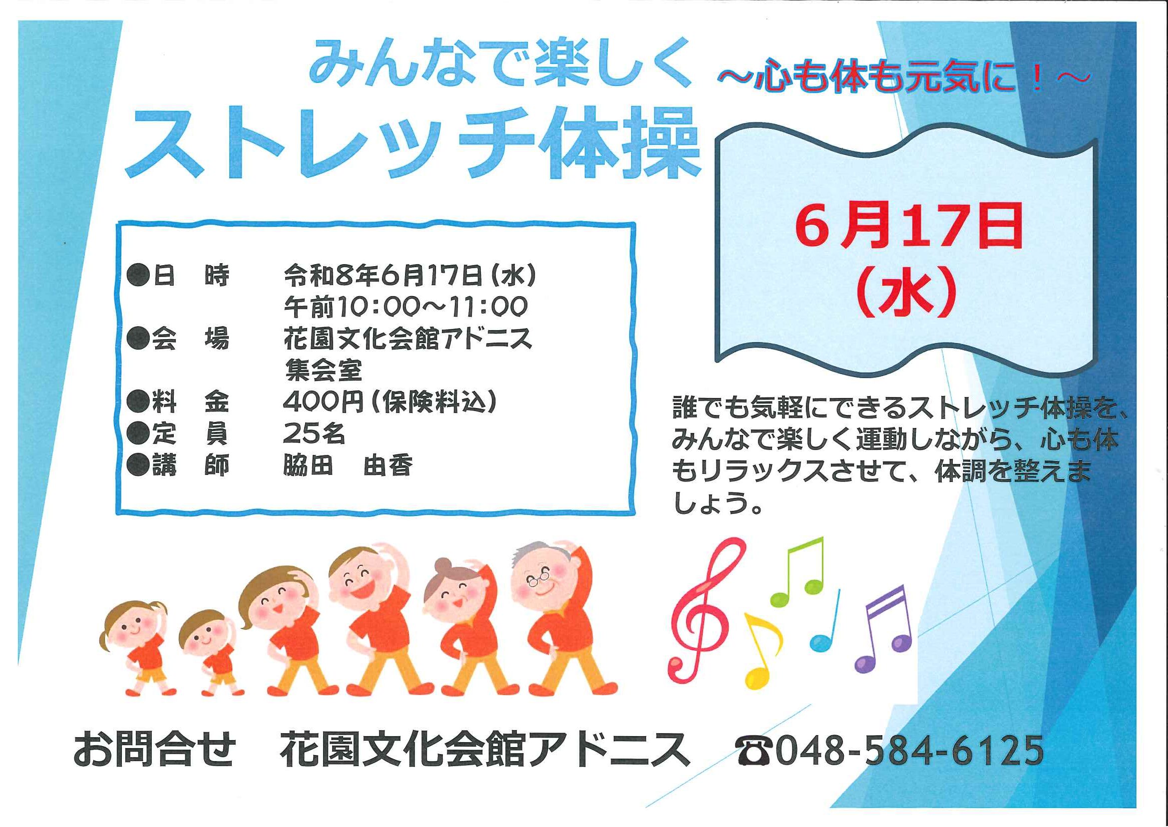 2026 6/17 6/17 みんなで楽しくストレッチ体操 開催日 2026年6月17日(火) 時 間 午前10時から11時 場 所 花園文化会館アドニス 集会室 参加料 500円(保険料込) 定 員 25名 ※定員になり次第終了 講 師 脇田 由香 申込方法 6月2日(火)から電話予約または来館受付 主 催 公益財団法人深谷市地域振興財団 お問合せ 花園文化会館アドニス ☎048-584-6125 Post Share Hatena Line RSS feedly Pin it note イベント一覧
