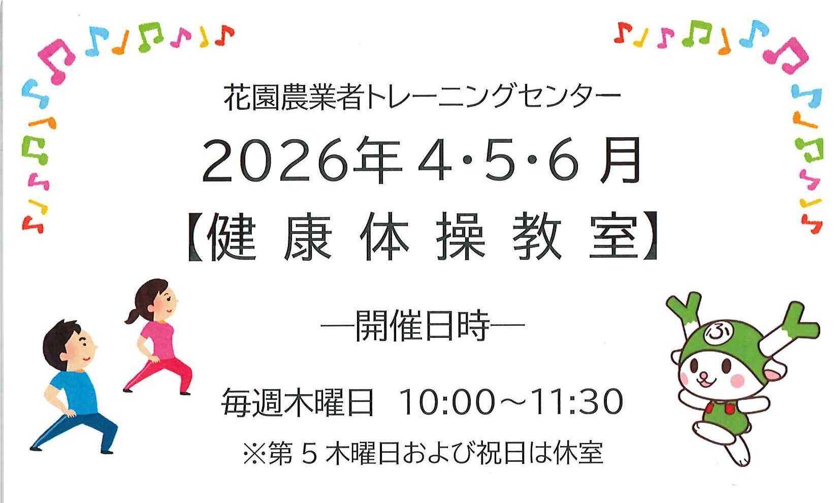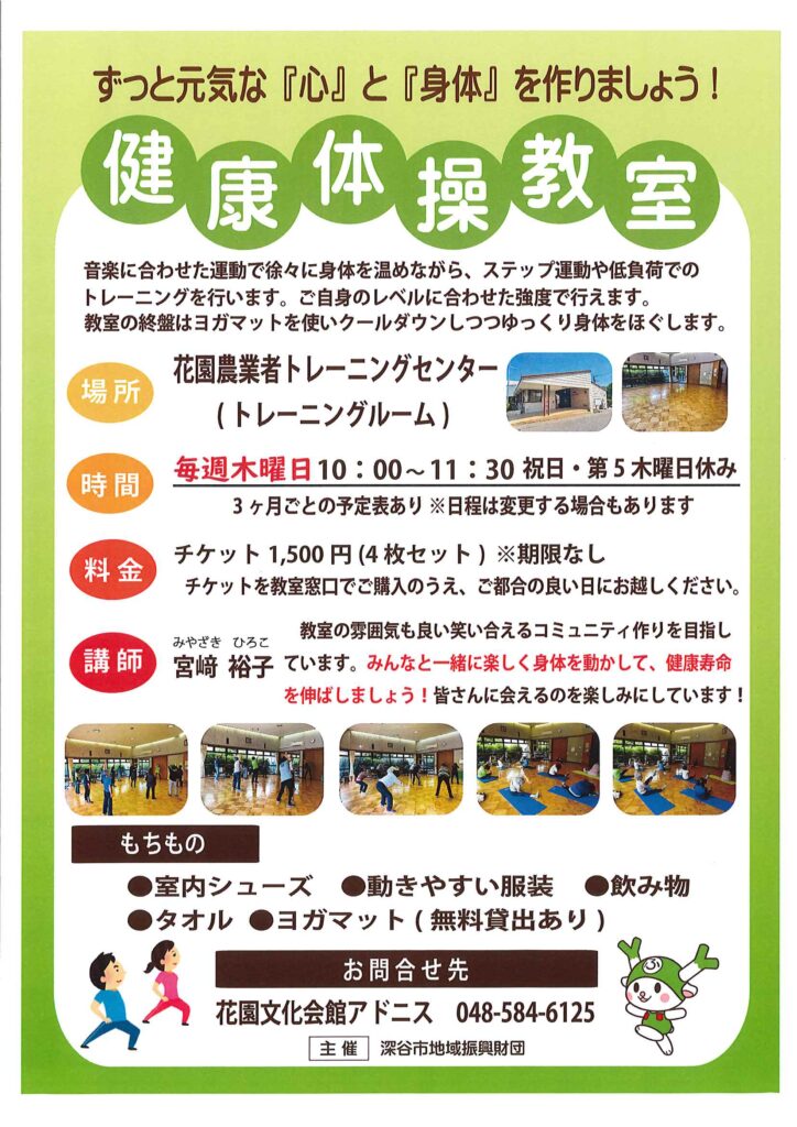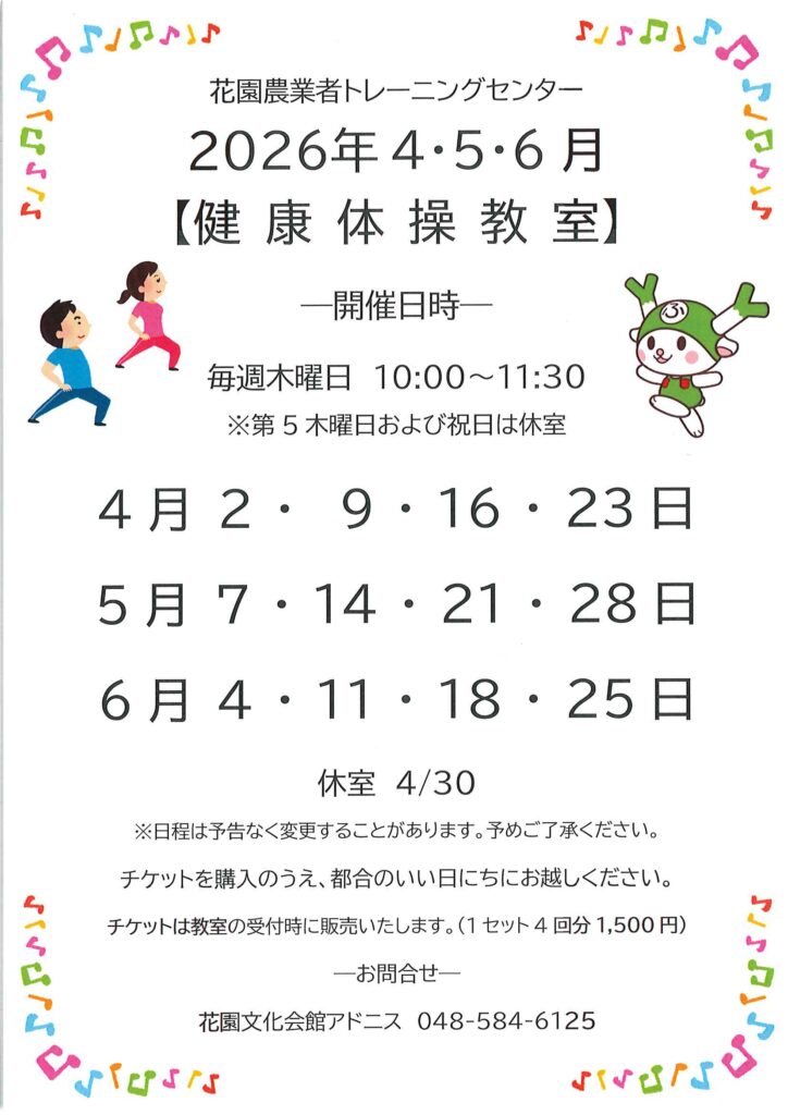 NEWS 花園農業者トレーニングセンター「健康体操教室」より4・5・6月の予定表を更新しました! 2026.03.12 2026.04.10 NEWS 2026年4.5.6 月予定表 Post Share Hatena Line RSS feedly Pin it note 4/25 アドニスカルチャー教室「紫外線対策も考えた春のメイクアップ講座」 前の記事 5/30 Enjoy!グランドピアノ(試弾会) 次の記事 新着のお知らせ 第13回ふかや音楽フェスタ 2026.04.24 5/30 Enjoy!グランドピアノ(試弾会) 2026.03.23 4/25 アドニスカルチャー教室「紫外線対策も考えた春のメイクアップ講座」 2026.03.03