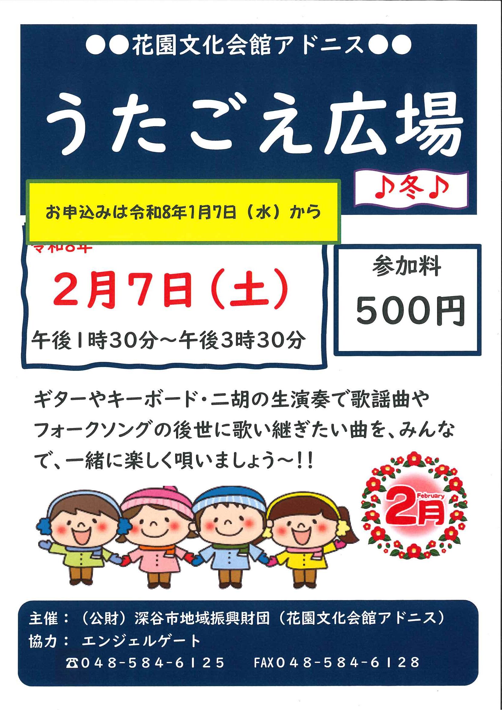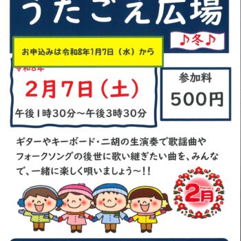 NEWS , TOPICS , お知らせ 2/7 うたごえ広場~冬~ 2025.11.12 NEWS , TOPICS , お知らせ 大好評の「うたごえ広場」🌟🌟🌟 「~冬~」は2月7日(土)です!! お申込みは2025年1月7日(水)からです Post Share Hatena Line RSS feedly Pin it note ~冬休み工作教室~ 親子で描いて飛ばすオリジナル和凧作り 前の記事 花園農業者トレーニングセンター「健康体操教室」より1・2・3月の予定表を更新しました! 次の記事 新着のお知らせ 花園農業者トレーニングセンター「健康体操教室」より1・2・3月の予定表を更新しました! 2025.11.29 ~冬休み工作教室~ 親子で描いて飛ばすオリジナル和凧作り 2025.11.09 12/14 クリスマスチャリティーフェスティバル 2025.11.04