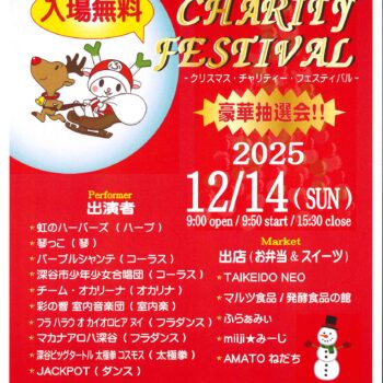 NEWS , TOPICS , お知らせ 12/14 クリスマスチャリティーフェスティバル 2025.11.04 NEWS , TOPICS , お知らせ クリスマスチャリティーフェスティバル開催します!当日はハープやコーラス琴演奏や室内楽・オカリナ、午後はフラダンスや太極拳・ダンスのパフォーマンスがあります!! 当日は美味しいお弁当やスウィーツの販売もありますので、1日楽しめます! 詳細はこちらから→ Post Share Hatena Line RSS feedly Pin it note 令和7年度 公益財団法人深谷市地域振興財団 新規採用職員募集 前の記事 新着のお知らせ 令和7年度 公益財団法人深谷市地域振興財団 新規採用職員募集 2025.11.04 11/23 Enjoy!グランドピアノ 2025.10.20 花園農業者トレーニングセンター「健康体操教室」より10・11・12月の予定表を更新しました! 2025.09.21