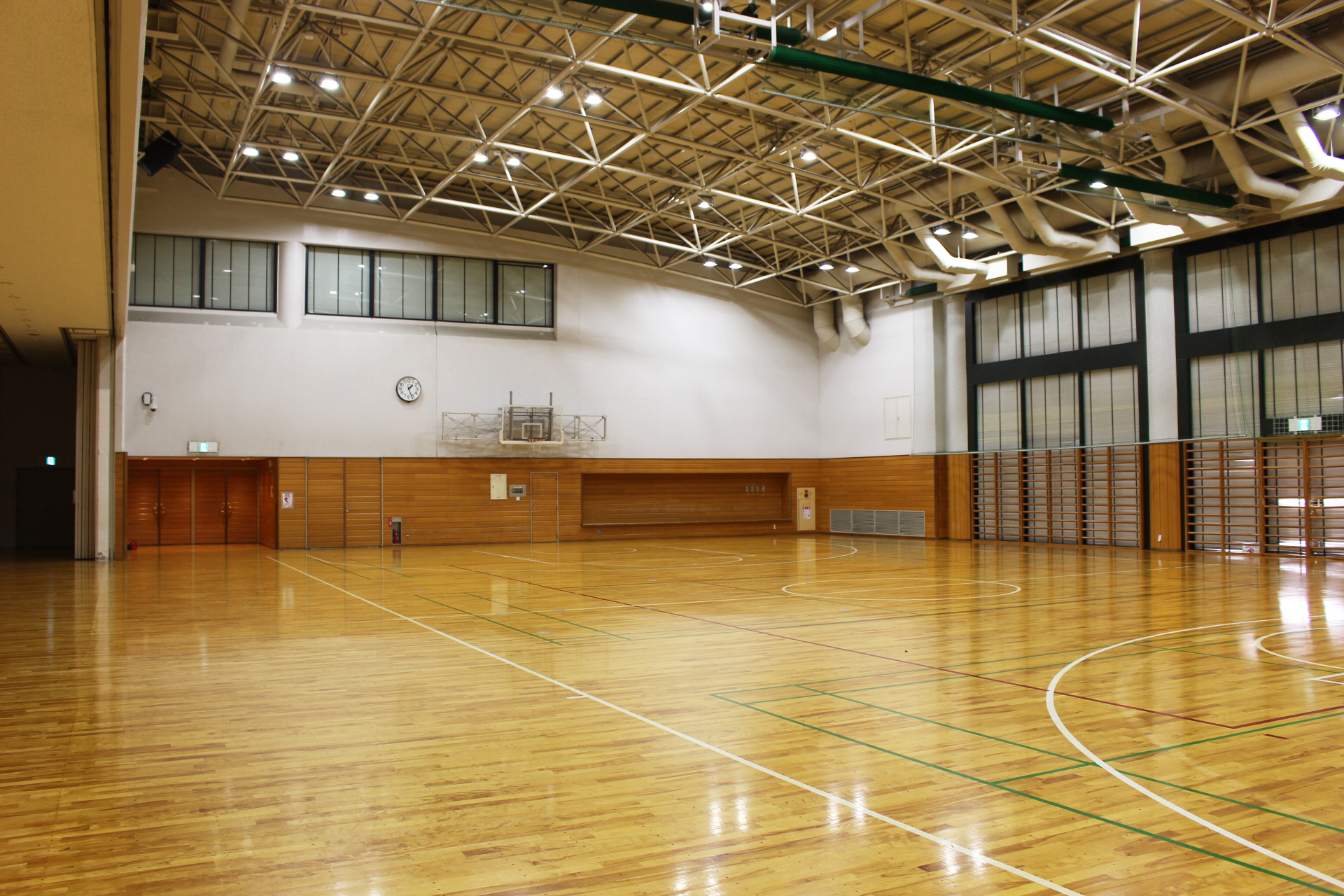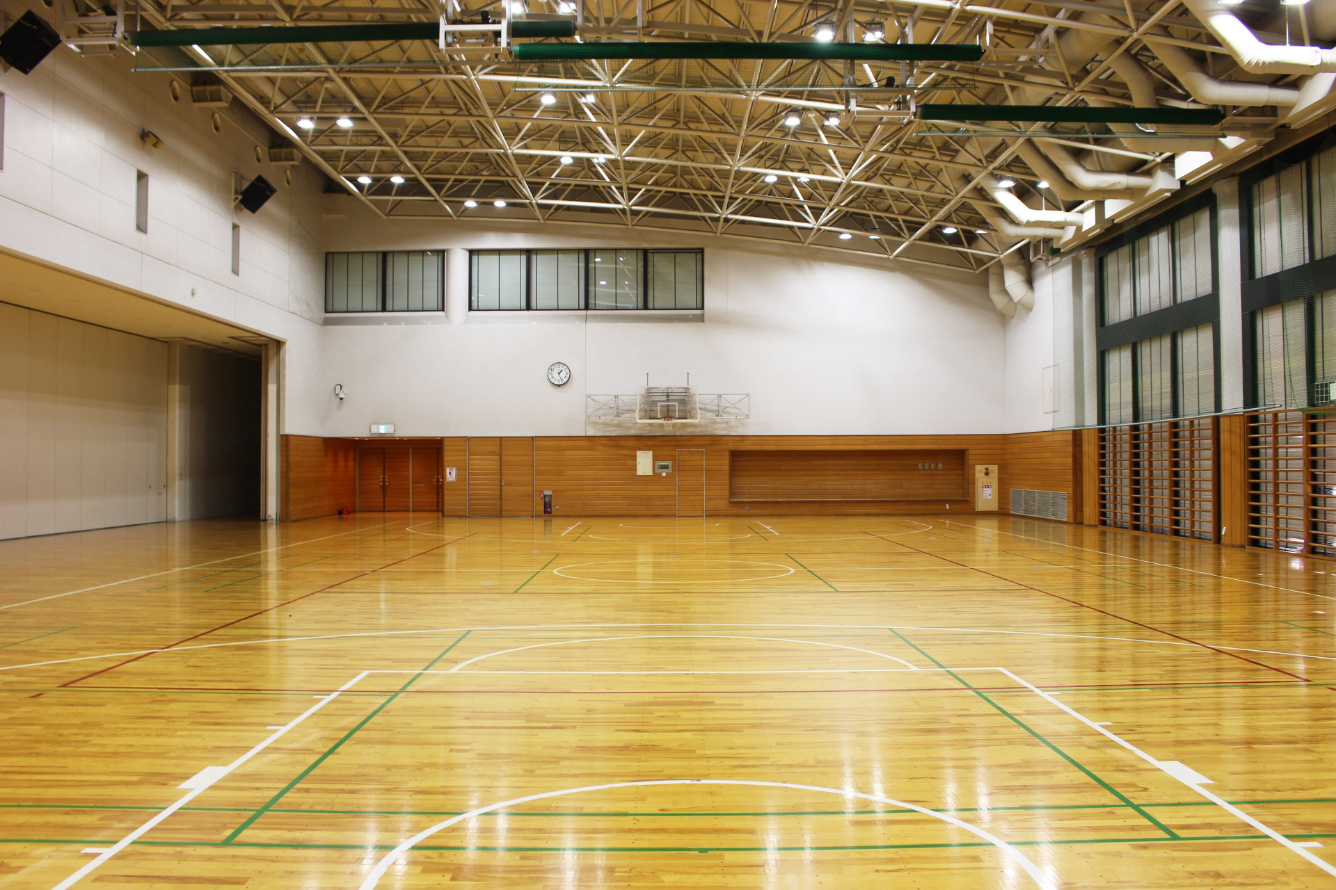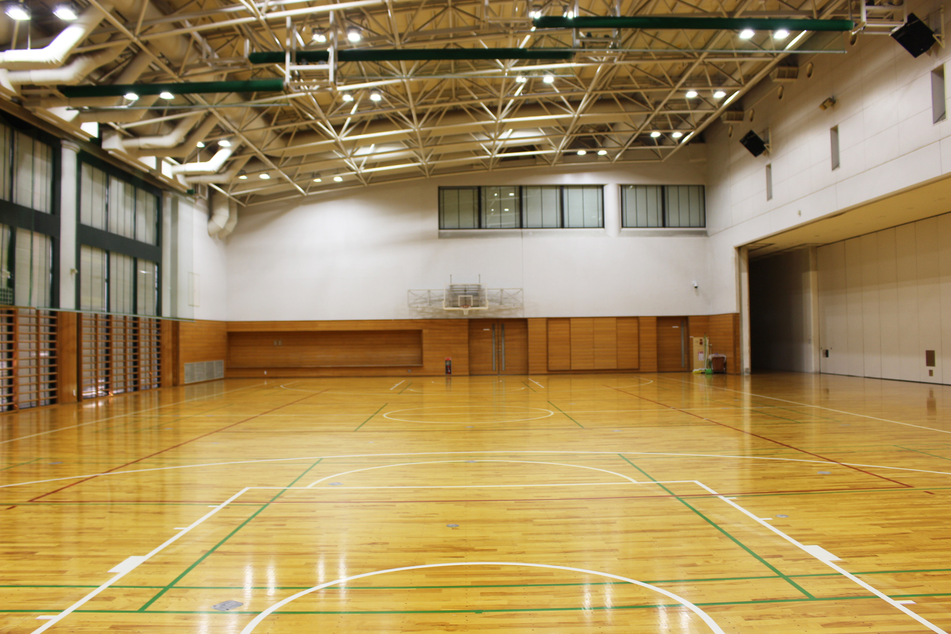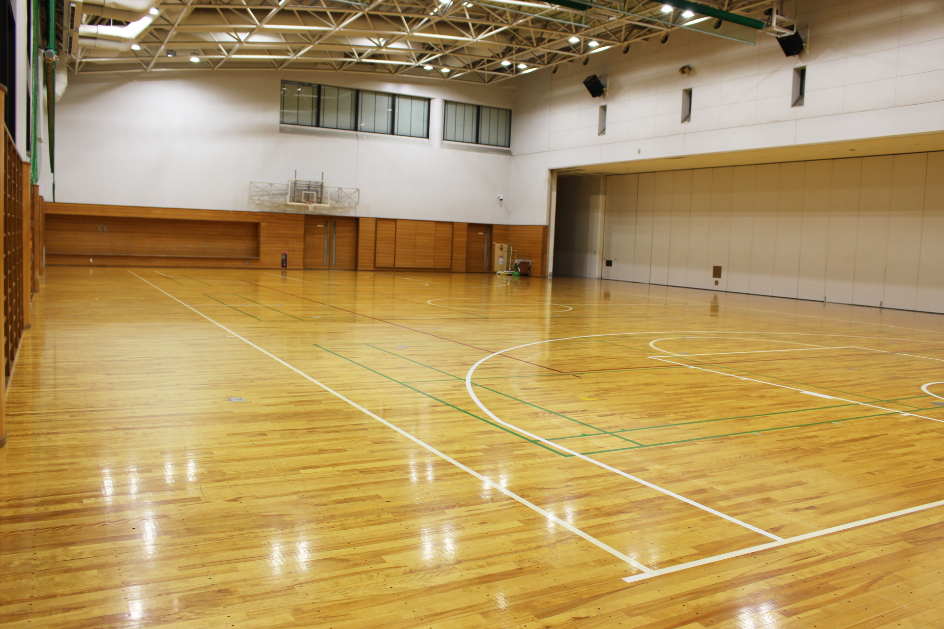 サブアリーナ sub-arena_01sub-arena_02sub-arena_03sub-arena_04sub-arena_05 サブアリーナ概要アリーナ平面図周辺図及び駐車場利用料金一覧表 バレーボール1面・バスケットボール1面・バドミントン3面が利用できる広さがあります。 可動間仕切りを開くと、メインアリーナと一体になり同時利用も可能です。 ◆サブアリーナ770m²(35m×22m)※実寸(34m×21m)高さ9m(最大)バレーボールコート 1面バスケットボールコート 1面バドミントンコート 3面サブアリーナ器具庫 150m² 関連資料・アリーナ平面図・周辺図及び駐車場・利用料金一覧表 アリーナ 平面図【PDF】 周辺図及び駐車場【PDF】 利用料金一覧表【PDF】 前のページ 施設案内 次のページ