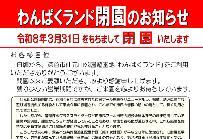 Pick Up 情報 わんぱくランド閉園のお知らせ(令和7年7月11日更新) 2025.07.11 2025.12.06 Pick Up 情報 わんぱくランドについて下記のとおりとなります。 ご理解、ご協力をお願いいたします。 Post Share Hatena Line RSS feedly Pin it note 券売機販売価格改定について(令和6年11月11日更新) 前の記事 令和8年度フィットネス教室スケジュールについて(令和8年3月5日更新) 次の記事 新着のお知らせ シャワー利用再開のお知らせ(令和8年3月26日更新) 2026.03.27 【お知らせ】令和8年3月28、29日 わんぱくランド「Grand Finale」開催のお知らせ(令和8年2月13日更新) 2026.03.10 ビッグタートル公式ブログ goo blogからameba blogへ変更になりました(令和7年10月8日更新) 2025.10.08
