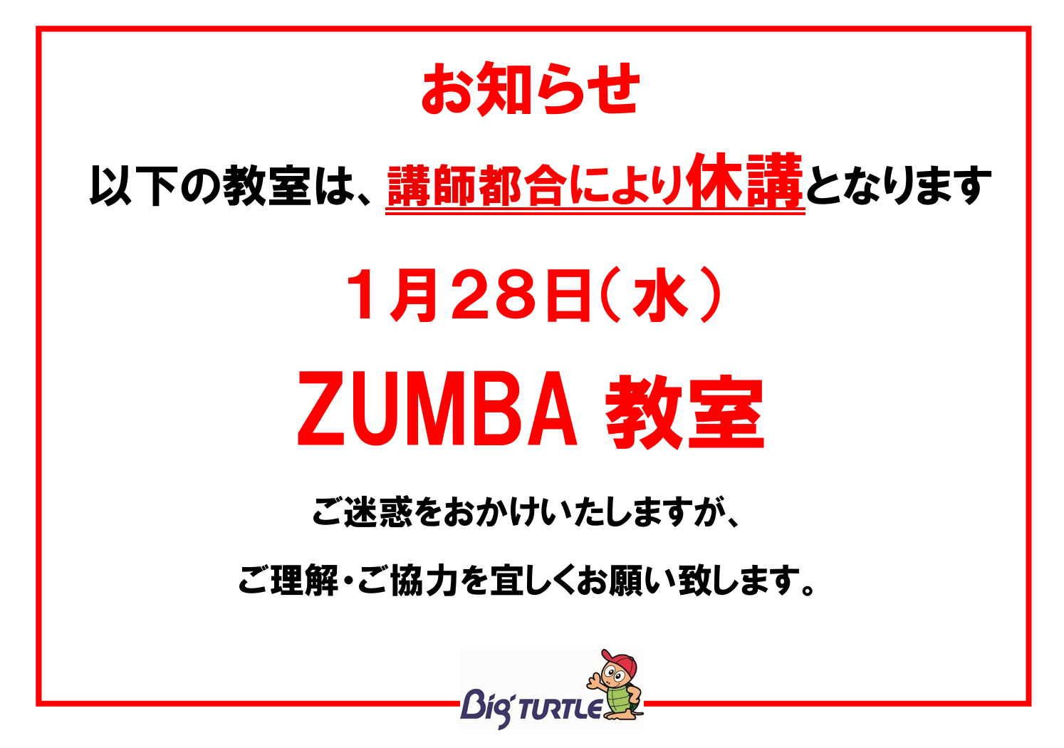 【お知らせ】ZUMBA教室 ◆休講のお知らせ◆(令和8年1月20日更新)