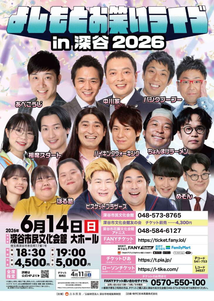 NEWS よしもとお笑いライブin深谷2026 2026.04.07 NEWS 「よしもとお笑いライブin深谷2026」の情報を掲載しました。 よしもとお笑いライブin深谷2026 Post Share Hatena Line RSS feedly Pin it note 深谷市民文化会館開館45周年記念 宝くじ まちの音楽会 岩崎宏美・岩崎良美~ふれあいコンサート 前の記事 世良公則 アコースティックソロライブ2026 ~迸る(hotobashiru)~生きるチカラが此処にある 次の記事 新着のお知らせ 世良公則 アコースティックソロライブ2026 ~迸る(hotobashiru)~生きるチカラが此処にある 2026.04.17 深谷市民文化会館開館45周年記念 宝くじ まちの音楽会 岩崎宏美・岩崎良美~ふれあいコンサート 2026.04.05 オーケストラワークショップ参加者募集 2026.04.05
