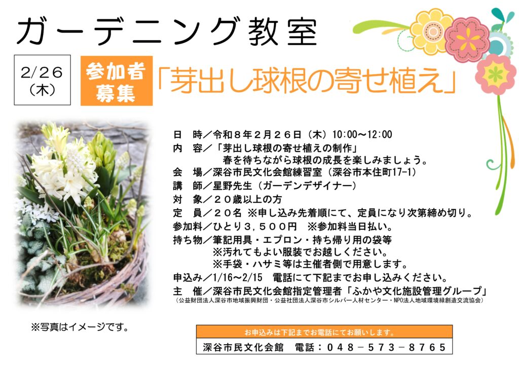 NEWS ガーデニング教室(芽出し球根の寄せ植え) 2025.12.19 2026.01.12 NEWS 「ガーデニング教室(芽出し球根の寄せ植え)」の情報を掲載しました。 ガーデニング教室 Post Share Hatena Line RSS feedly Pin it note 昭和歌謡コンサート(2月公演) 前の記事 新着のお知らせ 昭和歌謡コンサート(2月公演) 2025.12.11 御城印販売のお知らせ(皿沼城、庁鼻和城、東方城 追加) 2025.12.01 深谷市誕生20周年記念「第八回 秋のつぶやき・オータム川柳」入選作品一覧 2025.11.04