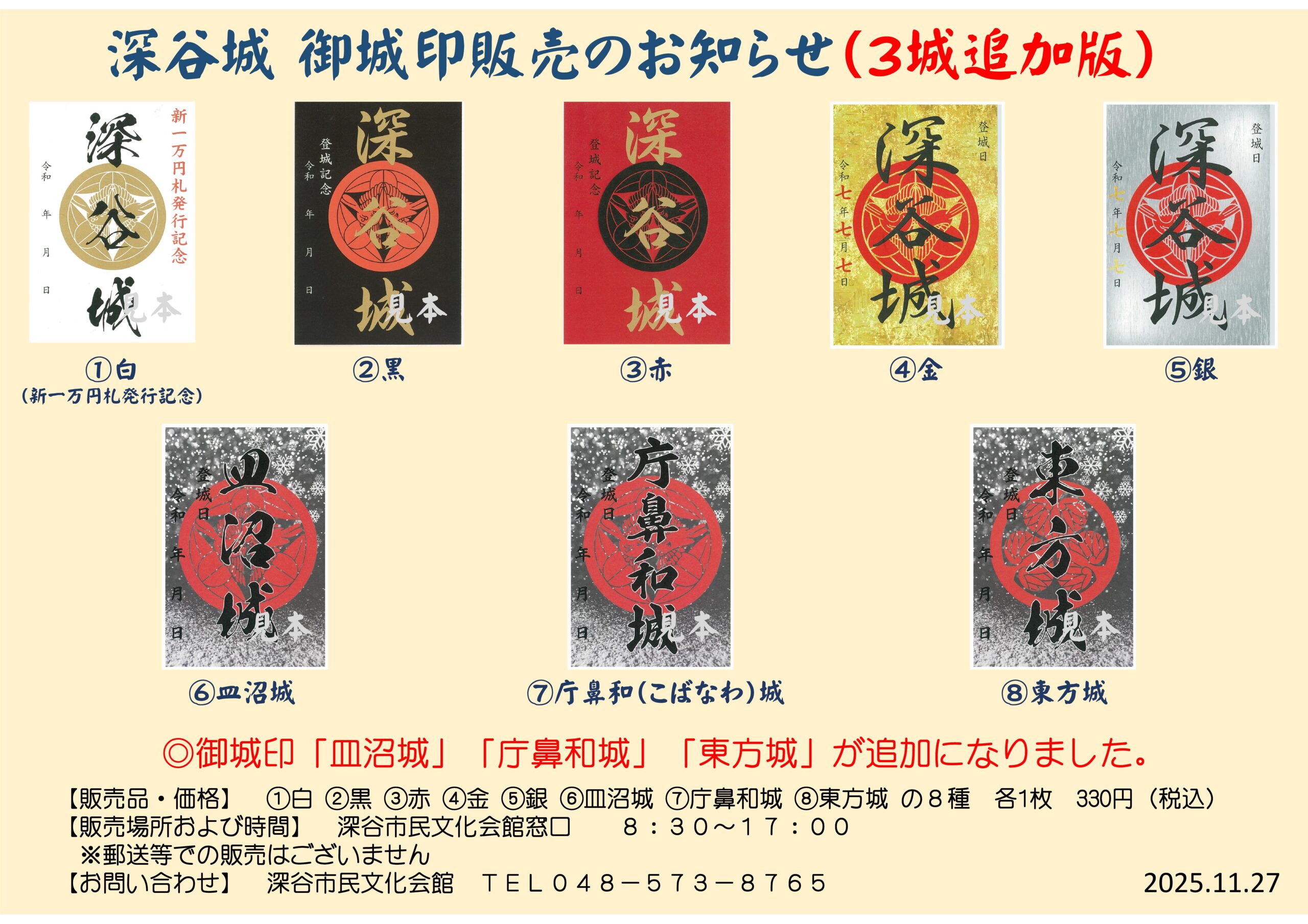 NEWS 御城印販売のお知らせ(皿沼城、庁鼻和城、東方城 追加) 2025.12.01 2025.12.04 NEWS 「深谷城」に加え、新たに「皿沼城」「庁鼻和城」「東方城」の御城印が追加になりました。 文化会館窓口にて販売しております。 ぜひ、お買い求めください。 Post Share Hatena Line RSS feedly Pin it note 深谷市誕生20周年記念「第八回 秋のつぶやき・オータム川柳」入選作品一覧 前の記事 新着のお知らせ 深谷市誕生20周年記念「第八回 秋のつぶやき・オータム川柳」入選作品一覧 2025.11.04 江上兄弟と細貝柊・武田圭司の昭和歌謡コンサート 2025.10.07 島津亜矢 40周年記念コンサートツアー2026~ありがとう~ 2025.10.07