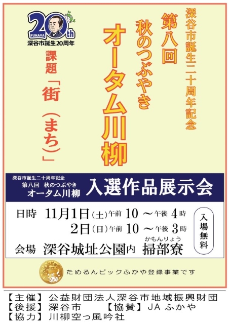 「第八回 秋のつぶやき オータム川柳 入選作品展示会」の情報を掲載しました。