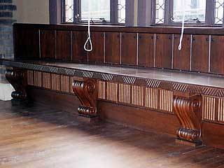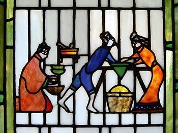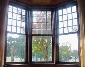 誠之堂大広間の暖炉脇の窓には、6面のステンドグラスが配され、大きな見所となっています。