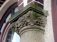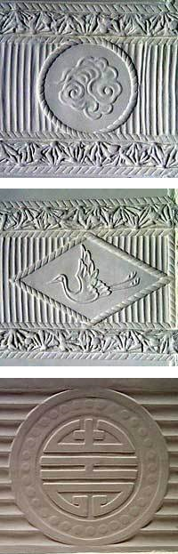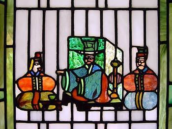 中国風の珍しい題材ですが、これは設計者の田辺によれば、中国漢代の「画像石」の図柄を模したものです。庶民貴人と侍者、それを饗応する歌舞奏者や厨房の人物たちの像は、栄一を貴人に見立て喜寿を祝う情景と考えられています。