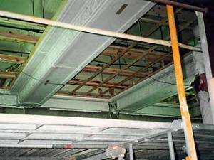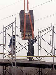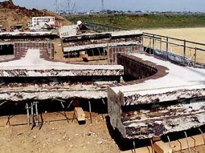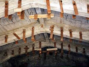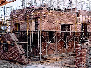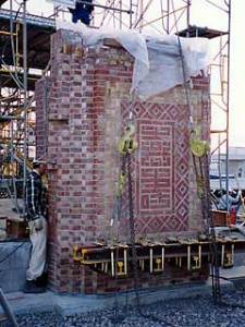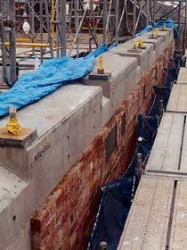 積み上げた煉瓦を固定するために、コンクリートのがりょうを巡らせました。がりょう上部から煉瓦壁を通じ基礎までPC鋼棒を貫通させ、ボルトで締め付け、煉瓦壁体を固定しました。