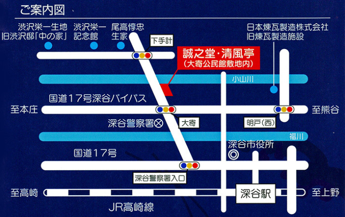 誠之堂・清風亭は、JR高崎線深谷駅北口から北に約4キロメートル。自動車で10分、徒歩で1時間ほどの距離にあります。