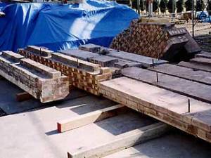 その結果、2棟の移築場所は大寄公民館敷地内とし、「大ばらし」を応用した日本初の工法により実施することに決定しました。これは、煉瓦壁をなるべく大きく切断して搬送し、移築先で組み直す工法です。大ばらしの部材は、解体工事と並行して、順次深谷市へ移送され、解体部材は移築予定地から300mの地点に所在する旧深谷農協本店敷地内に仮置きされました。