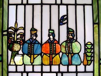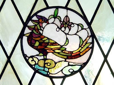 デザインは誰によるものかは不明ですが、製作は、大広間のものと同じく宇野澤組ステンドグラス製作所によると推定されています。