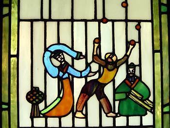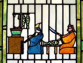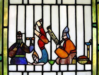 図案は、田辺の部下であった森谷延雄(明治26年-昭和2年、1893-1927)によることがわかっています。また、記録はありませんが、点付けハンダの技法等から、製作は、宇野澤組ステンドグラス製作所によると推定されています。