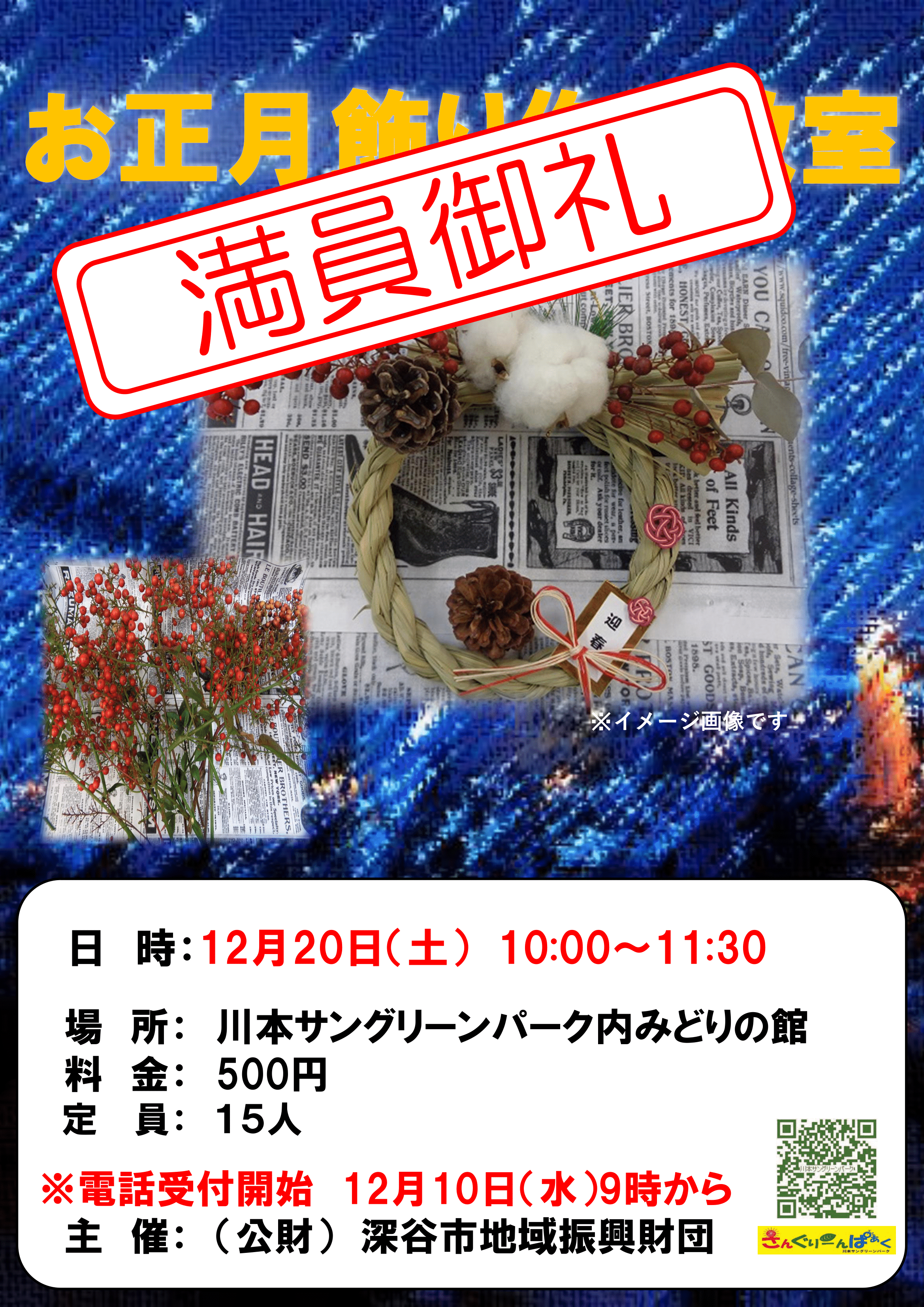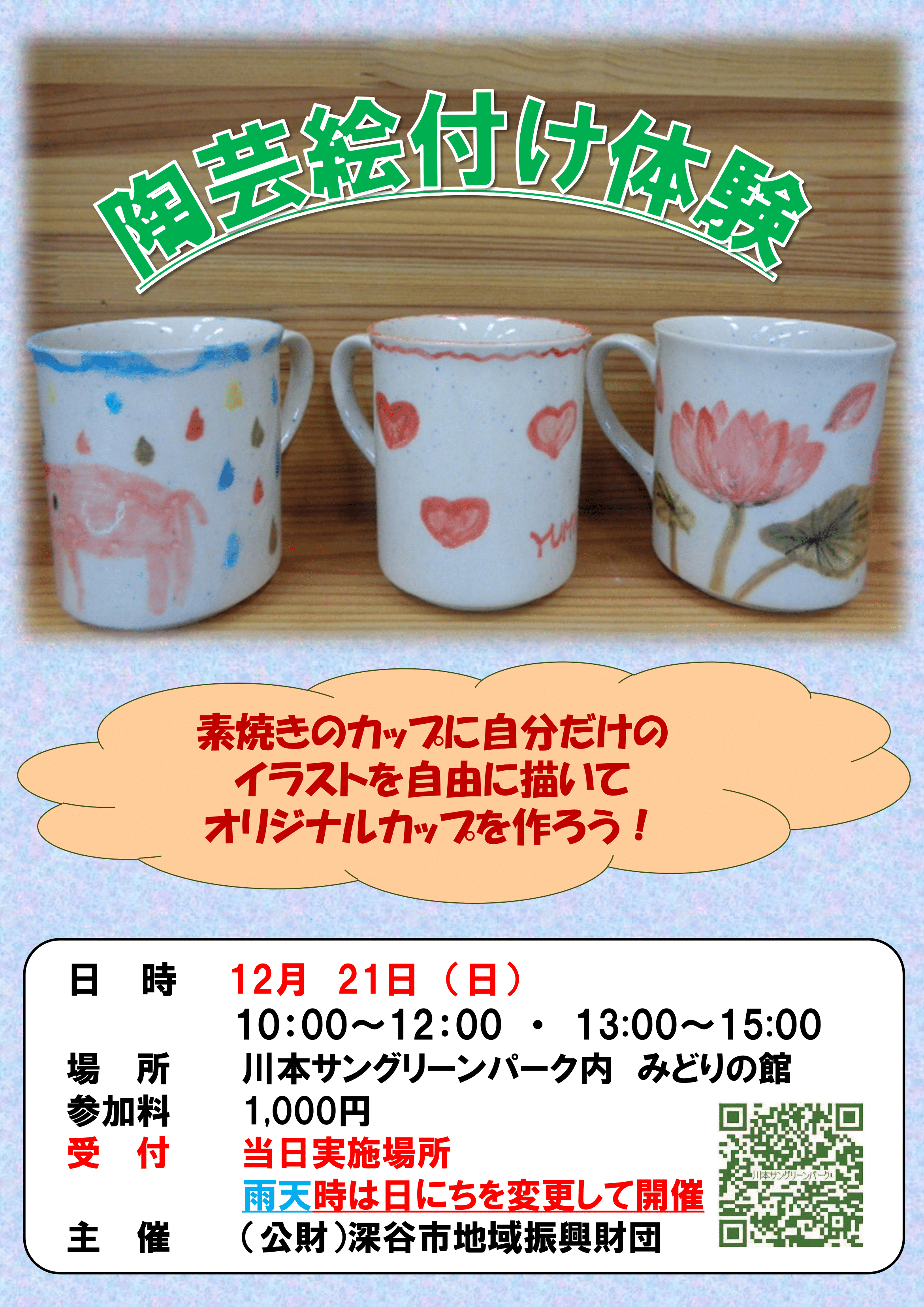 ・季節の野菜収穫体験 20日(土) ・お正月飾り作り体験教室 予約終了しました! 21日(日) ・陶芸体験教室(絵付け) |
