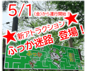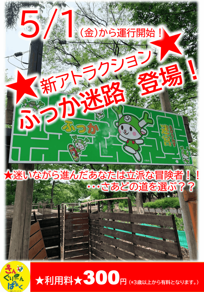 2026 5/1 新規アトラクション利用開始! 令和8年5月1日より、新アトラクション「ふっか迷路」が運行開始となります。 利用料金は300円(3歳以上から有料)となります。 非常に大きい迷路となっていますので、大人も子どもも楽しめる迷路です。是非ご利用ください! Post Share Hatena Line RSS feedly Pin it note イベント一覧
