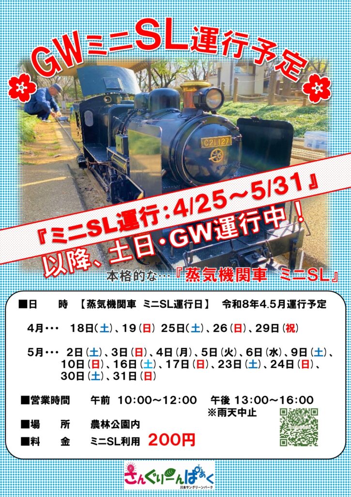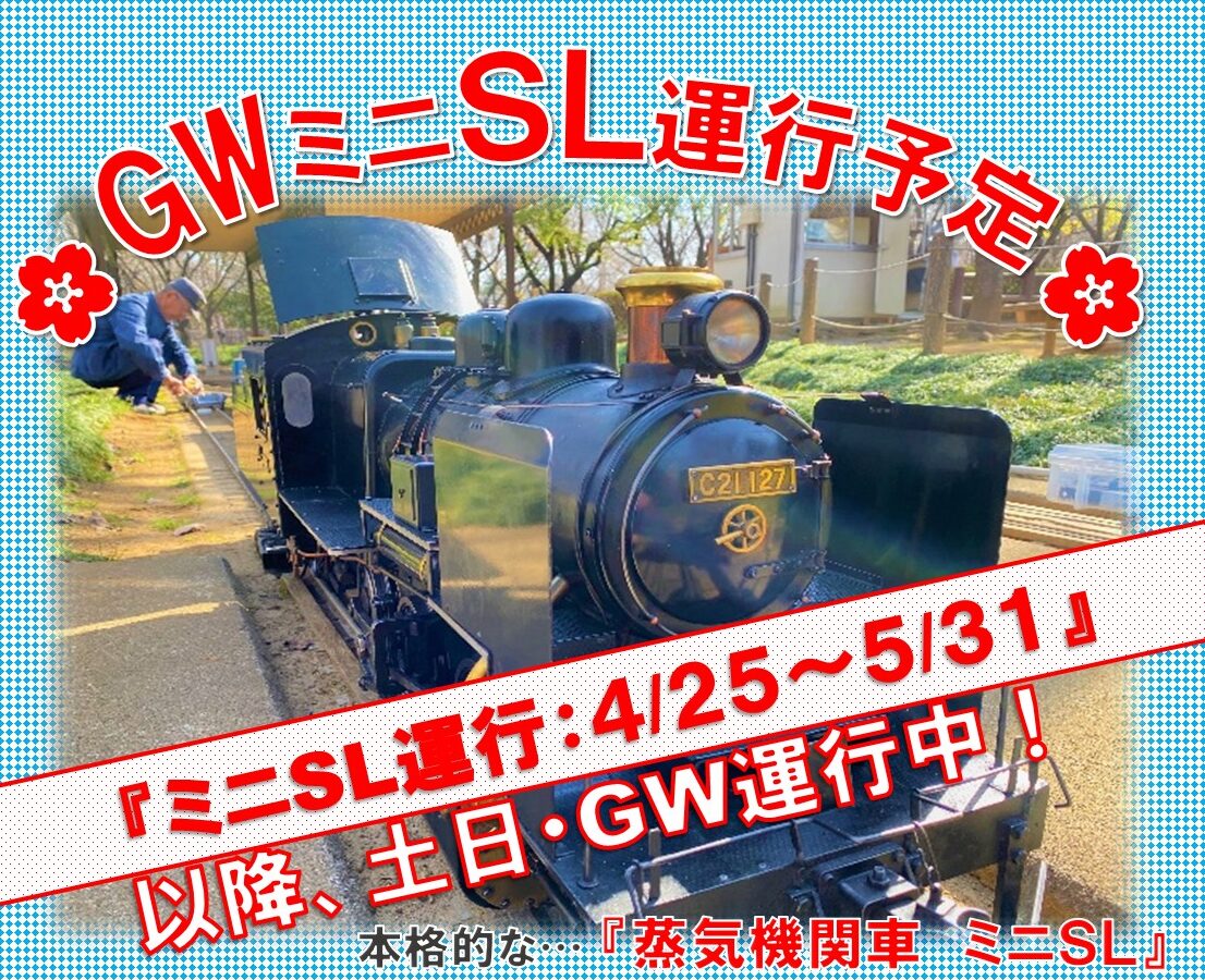 GWミニSL運行日程のお知らせ GWのミニSL運行日程につきまして、以下の日程で運行を予定しております。 期間は、4月土日、4月29日(祝)、5月2日~5月6日(GW)、毎週土日となりますので、ご理解ご協力をお願い致します。 みんなミニSLでGWの思い出を作ろう! Post Share Hatena Line RSS feedly Pin it note イベント一覧 今月の開催日 2026年4月1日2026年4月2日2026年4月3日2026年4月4日2026年4月5日2026年4月6日2026年4月7日2026年4月18日2026年4月19日2026年4月25日2026年4月26日2026年4月29日