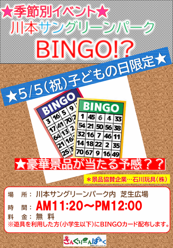 対象の方は、遊具の利用した小学生以下の方で、BINGOカードを配布しますので、当日係員にBINGOカードを貰ってね!