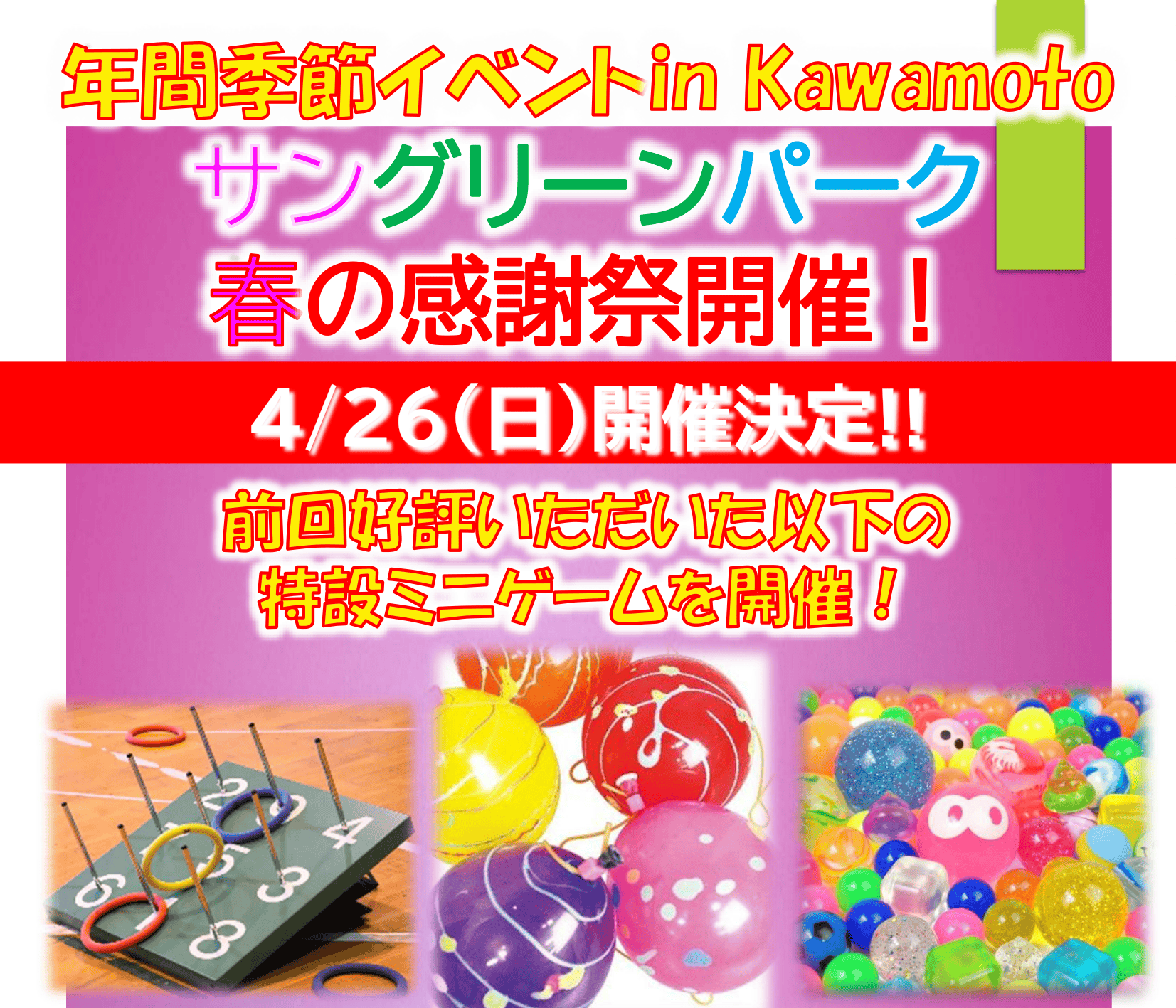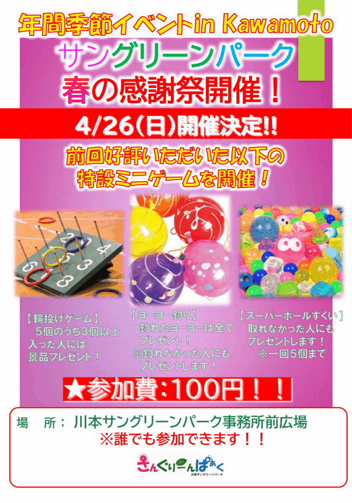 春の感謝祭開催のお知らせ 開催日時 令和8年4月26日(日) 時間 9:00~15:30(無くなり次第終了) 参加料 1回各100円 開催場所 川本サングリーンパーク事務所前広場 Post Share Hatena Line RSS feedly Pin it note イベント一覧 今月の開催日 2026年3月1日2026年3月20日2026年3月21日2026年3月22日2026年3月25日2026年3月26日2026年3月27日2026年3月28日2026年3月29日2026年3月30日2026年3月31日