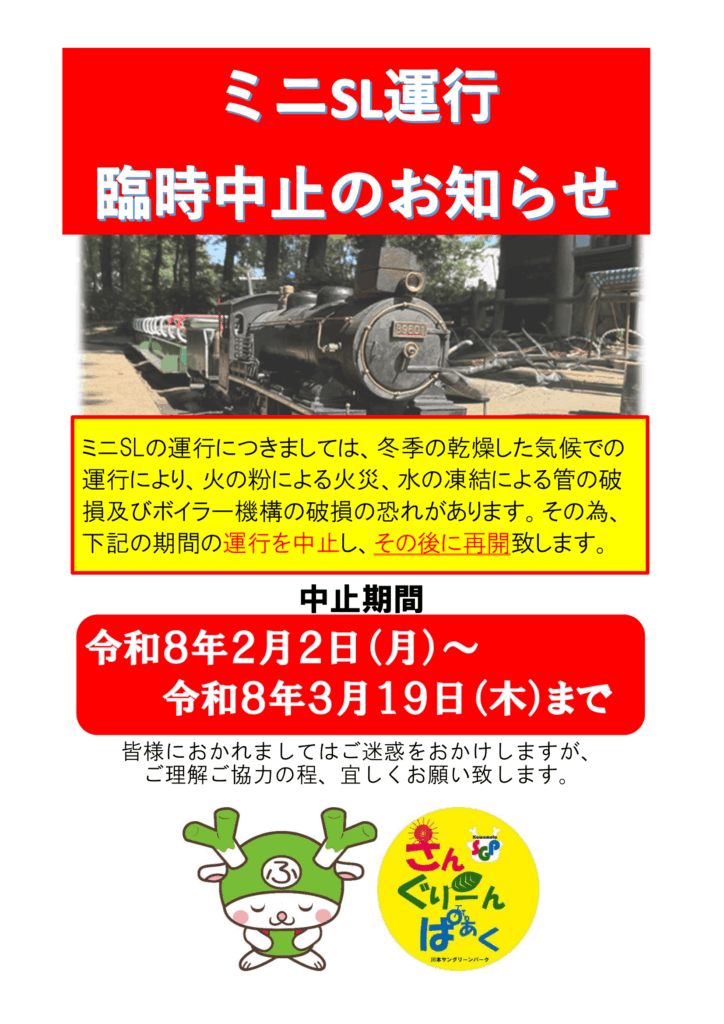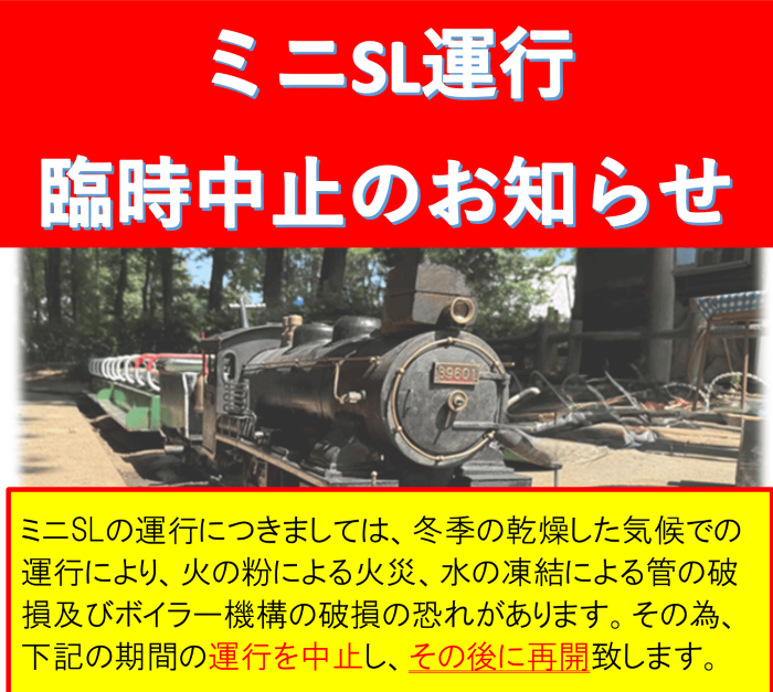 ミニSLの運行につきましては、冬季の乾燥した気候での運行により、火の粉により火災、水の凍結による管の破損及びボイラー機構の破損の恐れがあります。そのため、下記の期間の運行を中止し、その後に再開 致します。