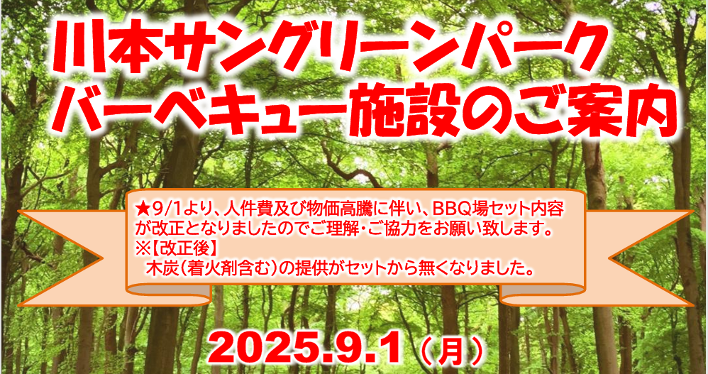 Pick Up 情報 BBQ場のセット内容改正のお知らせ 2025.08.11 2026.02.05 Pick Up 情報 9/1より、人件費及び物価高騰に伴い、BBQ場セット内容が改正となりましたのでご理解・ご協力をお願い致します。また、予約に関しましても9/1より開始致しますのでご了承ください。 くわしくはバーベキューのページをご覧ください。 Post Share Hatena Line RSS feedly Pin it note ホームページが新しくなります 次の記事 新着のお知らせ BBQ春の利用について 2026.02.17 ミニSL運行臨時中止のお知らせ 2026.02.05 ホームページが新しくなります 2026.02.05